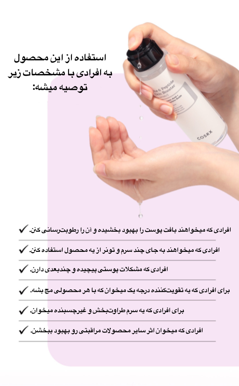 **** چند قطره از سرم 6 پپتاید COSRX در هر بار استفاده کافی است! از مصرف بیش از حد آن پیشگیری نمایید.