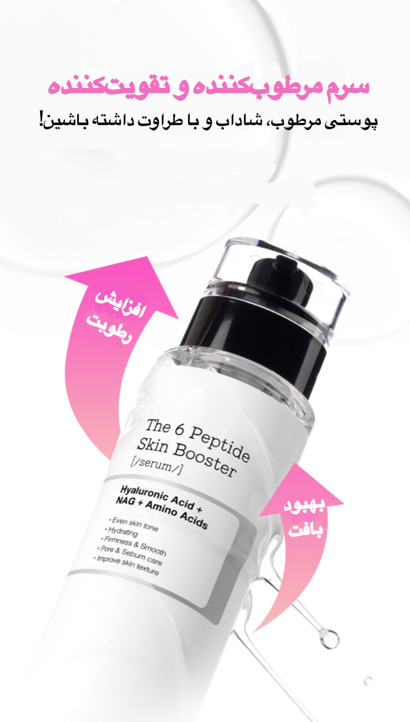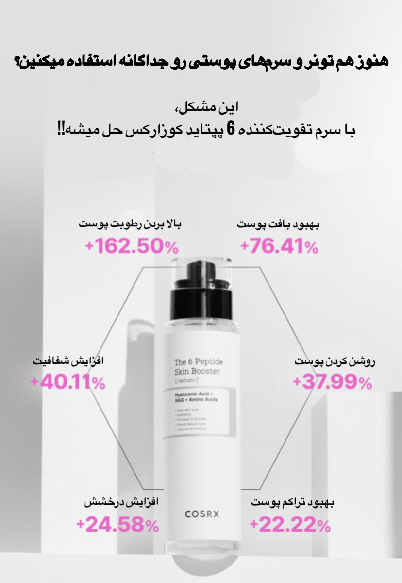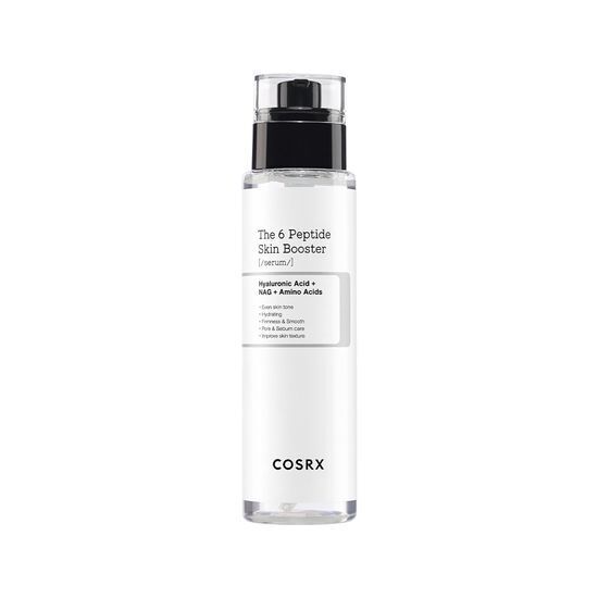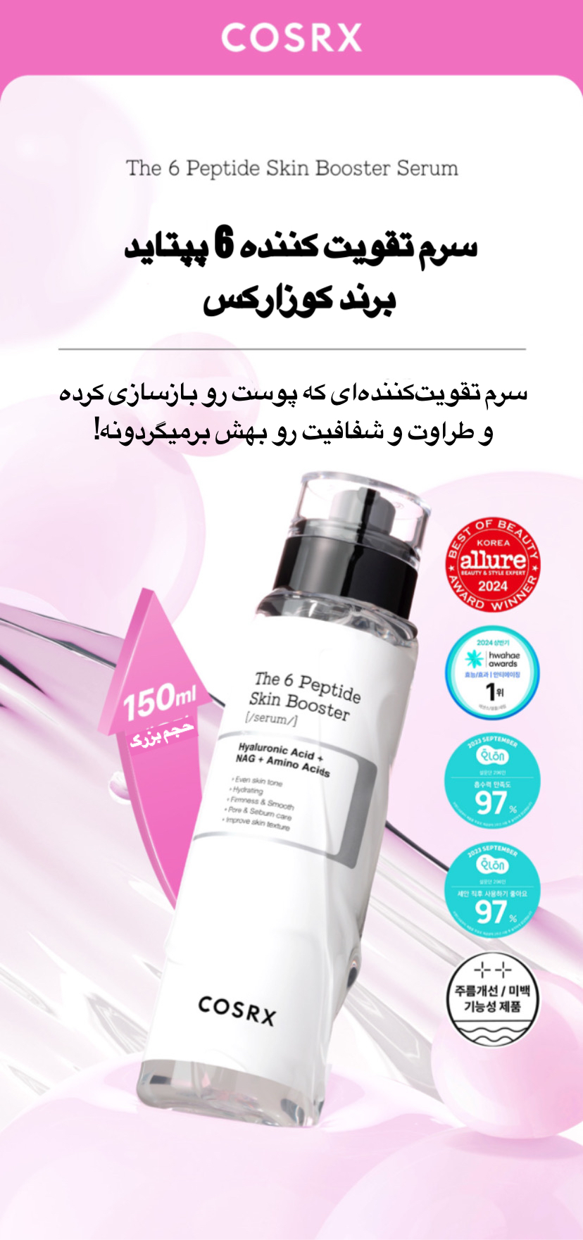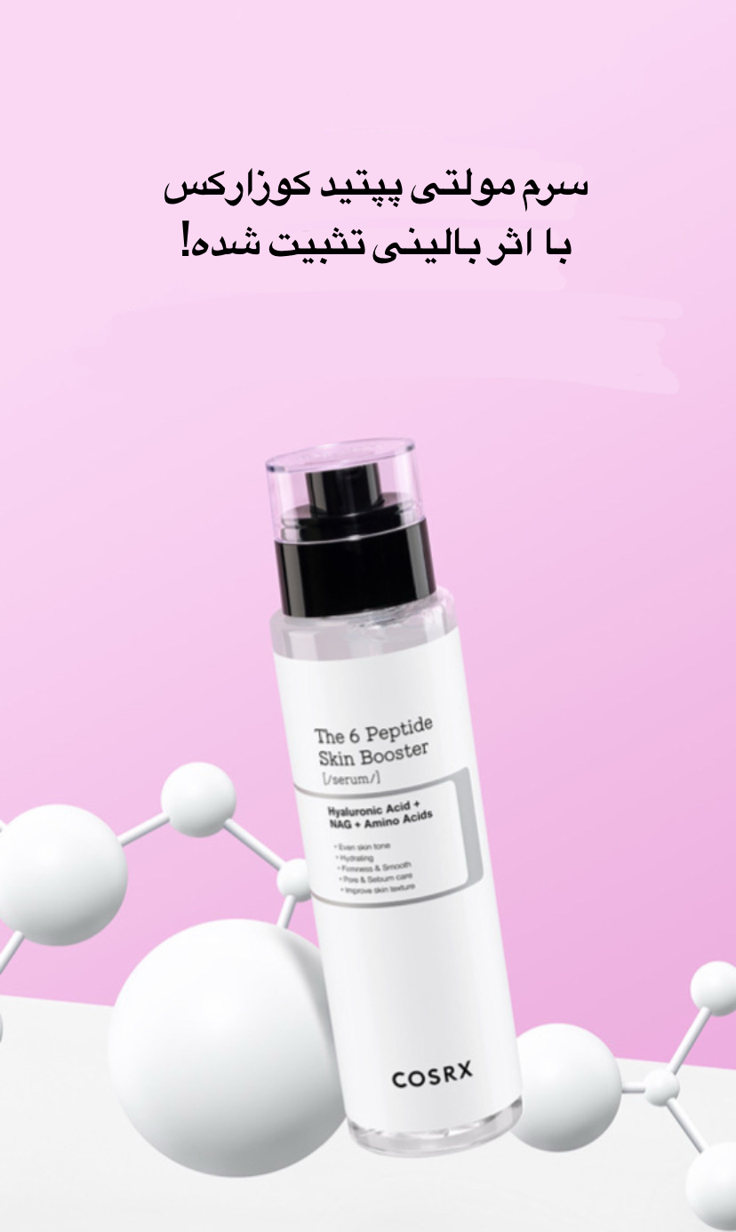 سرم تقویت کننده 6 پپتاید کوزارکس COSRX که در بازار با عنوان سرم بوستر تقویت کننده پوست یا 6 پپتید کوزارکس نیز مشهور است، محصولی همهکاره به شمار میرود که میتواند بخش عمدۀ نیازهای پوستی شما را در طی شبانهروز فراهم نماید. در این محصول، علاوهبر 6 پپتید ضروری، مقادیر قابل توجهی هیالورنیک اسید و نیاسینامید نیز بهکاررفته که میتواند ضمن آبرسانی عمقی پوست، آن را روشن کرده و از ایجاد یا گسترش لک و تیرگی پیشگیری کند. از دیگر مزایای استفاده از این محصول، میتوانیم به؛ بهبود بافت پوست، کوچک کردن منافذ باز، سفت کردن پوست و پیشگری از افتادگی آن، رفع چینوچروکها و خطور ریز، تسکین و التیام التهابات و قرمزی پوست، کنترل چربی و کاهش ایجاد جوش و همچنین خواص روشنکنندگی اشاره کنیم. این محصول، با تمامی تایپهای پوستی سازگاری داشته و انتخابی مناسب برای استفادۀ روزانه به شمار میرود. حجم این محصول 150 میلیلیتر بوده که به همراه 30 میلیلیتر اشانیتون (مجموعاً 180 میلیلیتر) عرضه شده است!