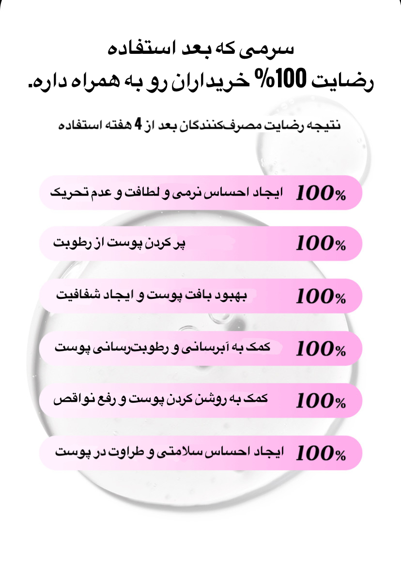 - مقدار کمی از سرم (چند قطره) را روی نوک انگشتان یا کف دست بریزید و سپس بهآرامی روی پوست تمیز صورت و گردن خود بمالید.