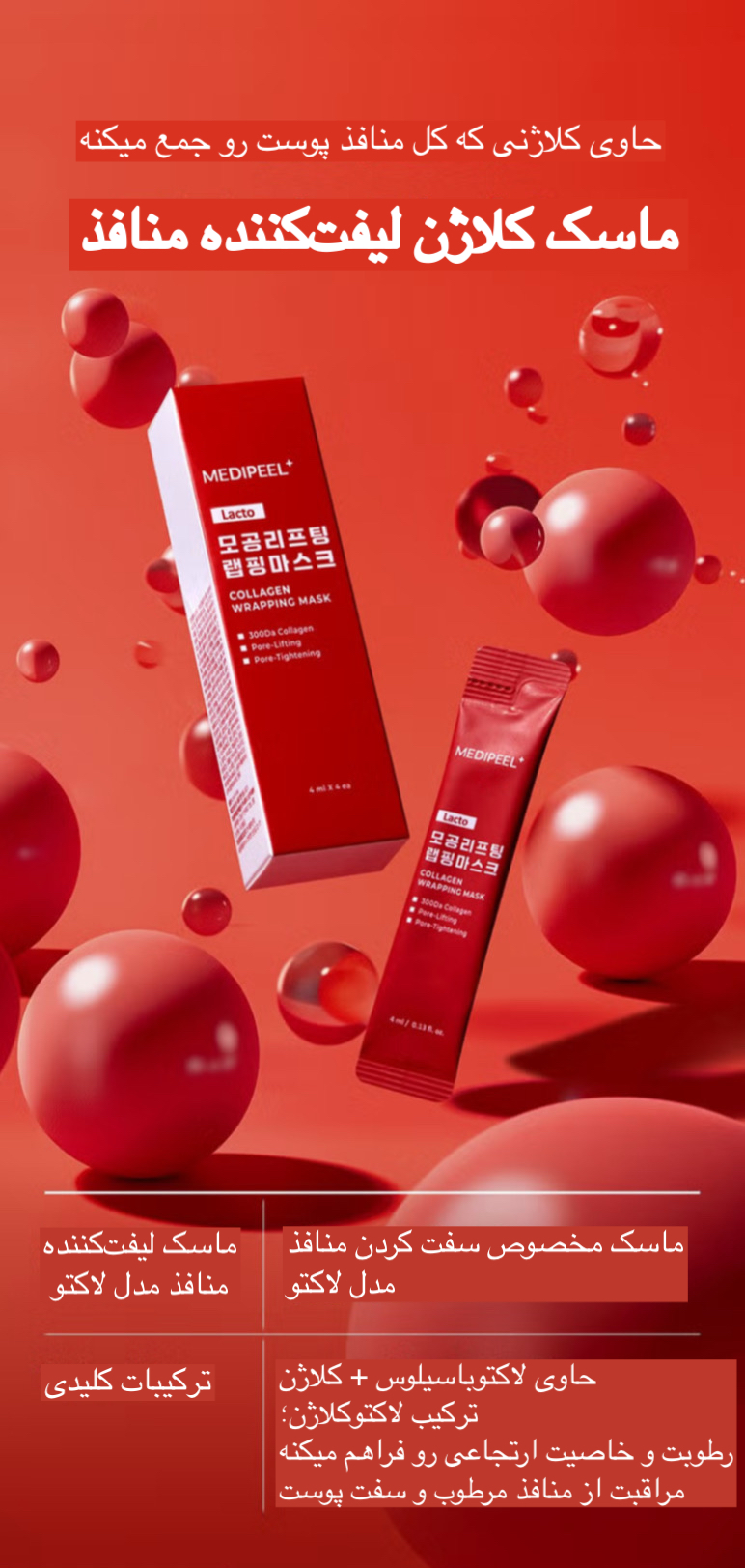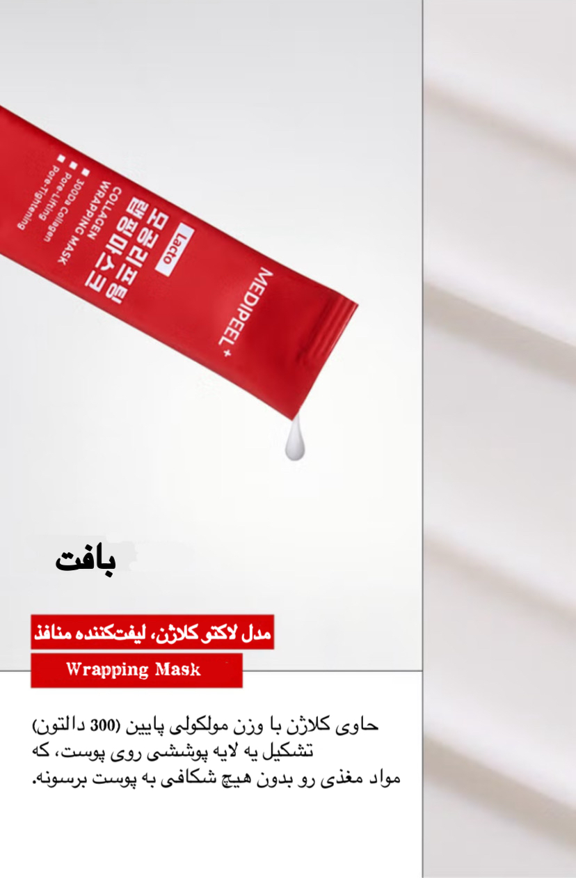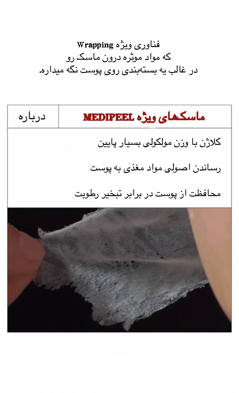 ماسک کلاژن کوچککنندۀ منافذ برند MEDIPEEL ترکیبی مؤثر از باکتریهای تخمیرشده به همراه کلاژن است که ضمن سفت کردن انواع منافذ باز و بهبود خاصیت ارتجاعی پوست، آن را رطوبترسانی کرده و افتادگی پوست در ناحیۀ گونه را برطرف میکند. فرمولاسیون ویژۀ این محصول، پوست را تغذیه کرده و رطوبت را به صورت متمرکز در سطح پوست نگه میدارد. گفتنی است که این محصول با تمامی تایپهای پوستی سازگاری داشته و تمامی افراد، حتی کسانی که پوست بسیار حساسی دارند با خیالی راحت میتوانند از این استفاده کنند.
