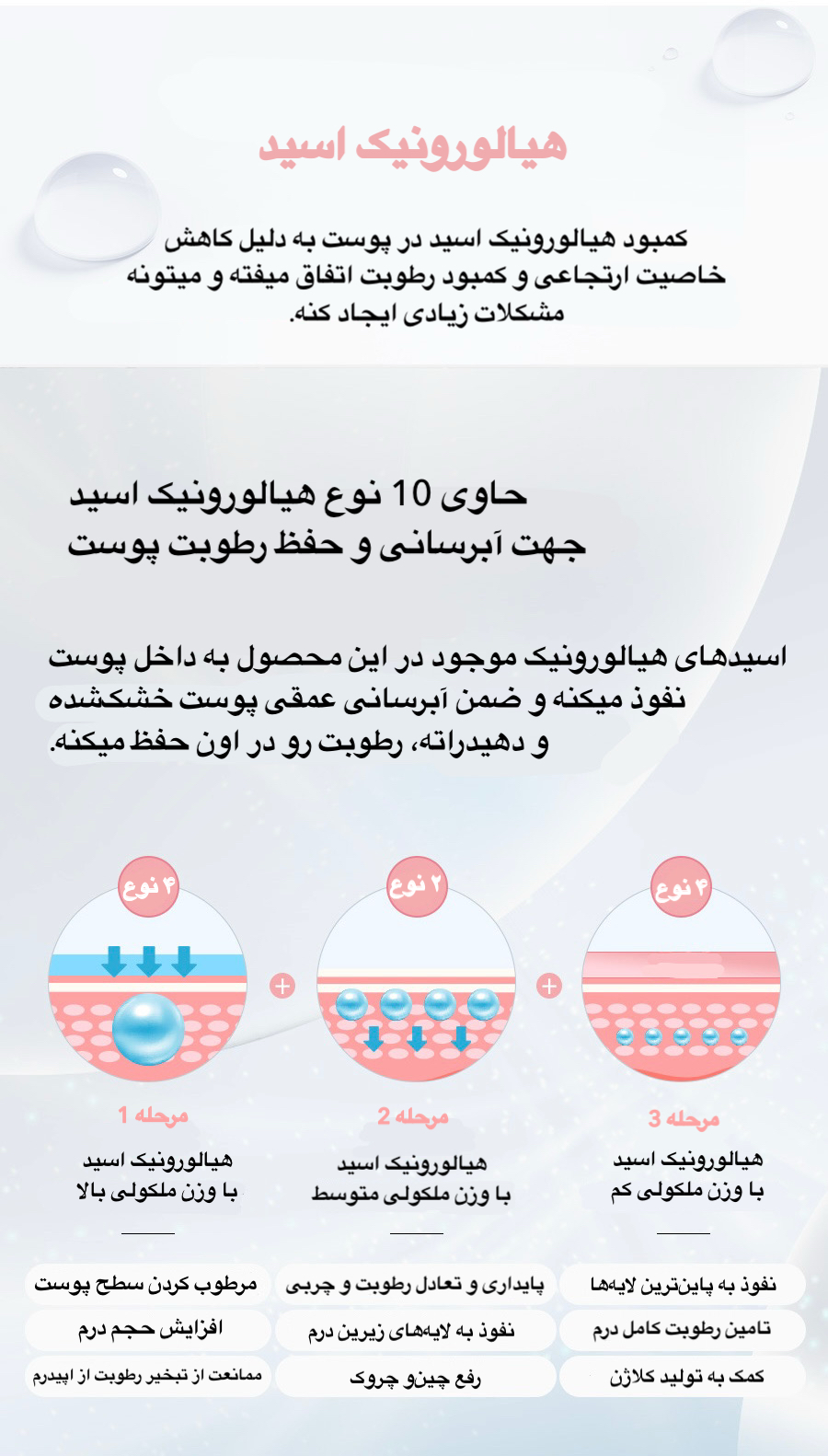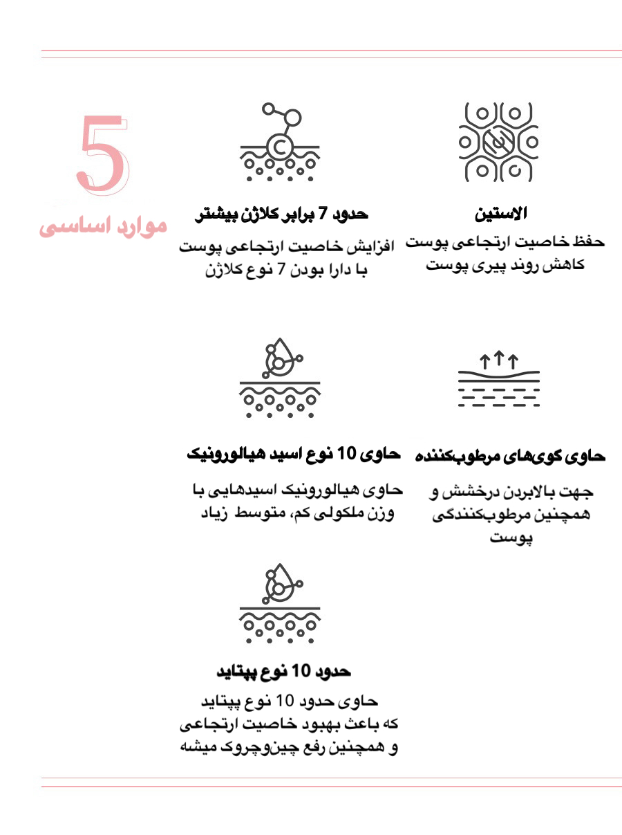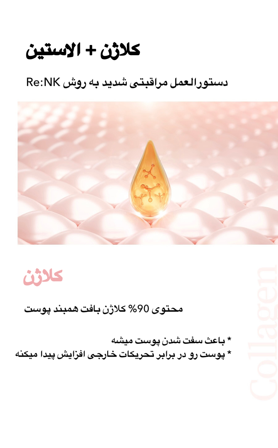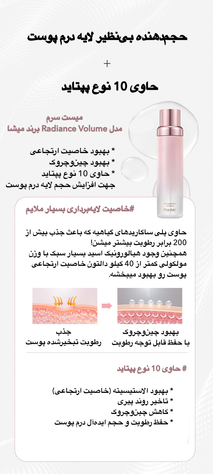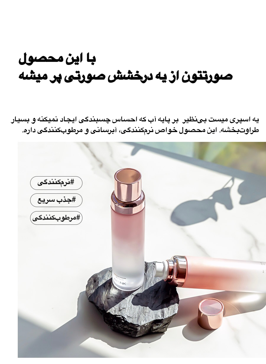 میست سرم روشن کننده، آبرسان و ضدچروک برند Re:NK یک اسپری آب ویژه است که علاوه بر آبرسانی پوست و ایجاد طراوت و شادابی در آن، خاصیت ارتجاعی پوست را بهبود بخشیده و روند پیری پوست را کنترل میکند. این محصول با دارا بودن 7 برابر کلاژن بیشتر، ساختار پوست را ارتقا داده و چین و چروک هارا برطرف میکند. این میست سرم بسیار ملایم و زود جذب بوده و با فرمولاسیون دقیقی که دارد، هیچگونه سنگینی و چسبندگی در پوست بر جای نخواهد گذاشت. همچنین گفتنی است که این محصول با تمامی تایپ های پوستی سازگاری داشته و انتخابی مناسب برای پوست های خسته، دهیدراته، کدر و حساس به شمار میرود که قبل خواب، قبل و بعد آرایش، به عنوان رطوبت رسان فوری در داخل یا خارج منزل برای صورت، گردن و سایر نواحی که به آبرسانی فوری نیاز دارند (آرنج، زانو، پاشنه پا) به صورت روزانه قابل استفاده میباشد.