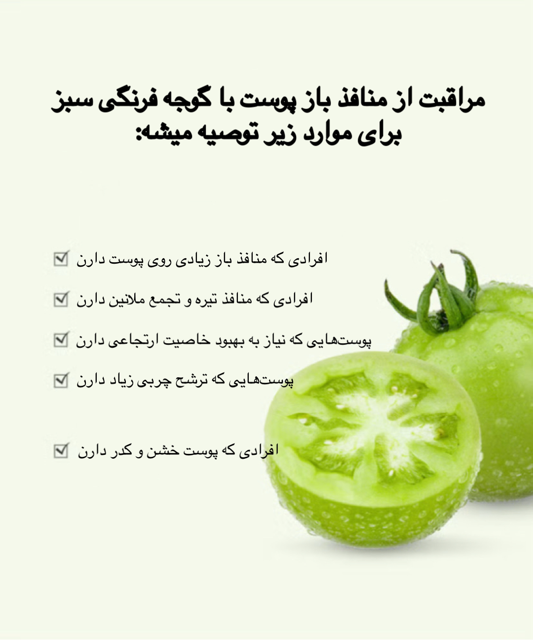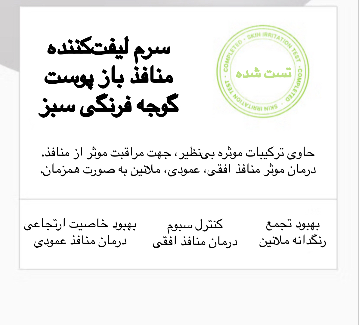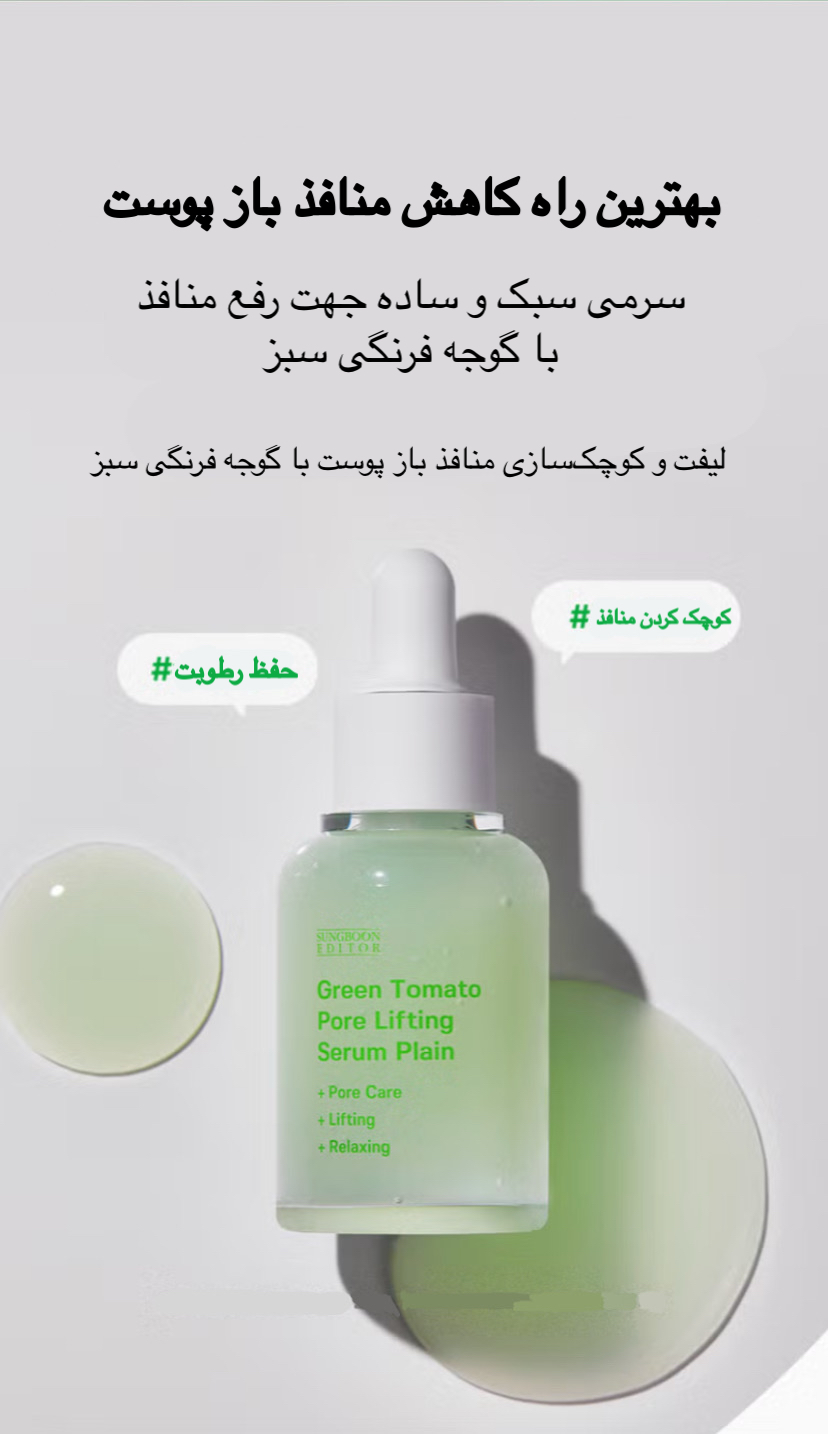 سرم کوچک کننده منافذ باز گوجه فرنگی سبز برند SUNGBOON EDITOR انتخابی بی نظیر، ساده و سریع جهت لیفت، کوچک سازی و درمان منافذ باز پوستی به شمار میرود. ترکیبات اختصاصی و ویژه موجود در این سرم باعث؛ بهبود تجمع رنگدانه ملانین شده و به بهبود لک ها و تیرگی های پوستی کمک شایانی میکند. از دیگر مزایای استفاده از این سرم میتوانیم به؛ کنترل ترشح سبوم، درمان تمامی انواع منافذ باز (افقی و عمودی)، بهبود خاصیت ارتجاعی، کند کردن روند پیری پوست، تسکین التهابات پوستی، رطوبت رسانی به پوست، پاکسازی پوست و حذف سلول های مرده، ایجاد درخشش و طراوت در پوست بدون ایجاد احساس سنگینی و چسبندگی اشاره کنیم. این محصول با تمامی تایپ های پوستی سازگاری کامل دارد و حتی افراد دارای پوست حساس نیز میتوانند از آن استفاده کنند.