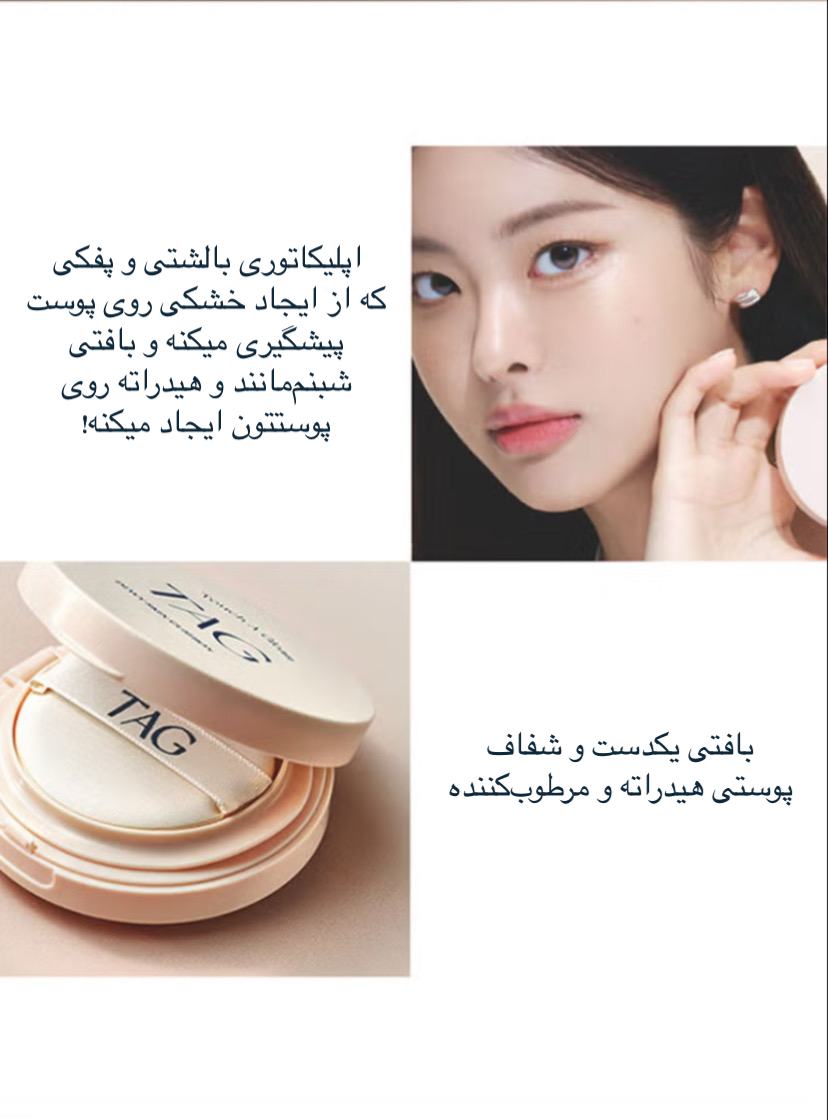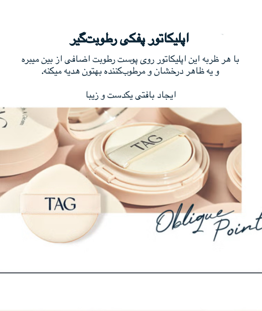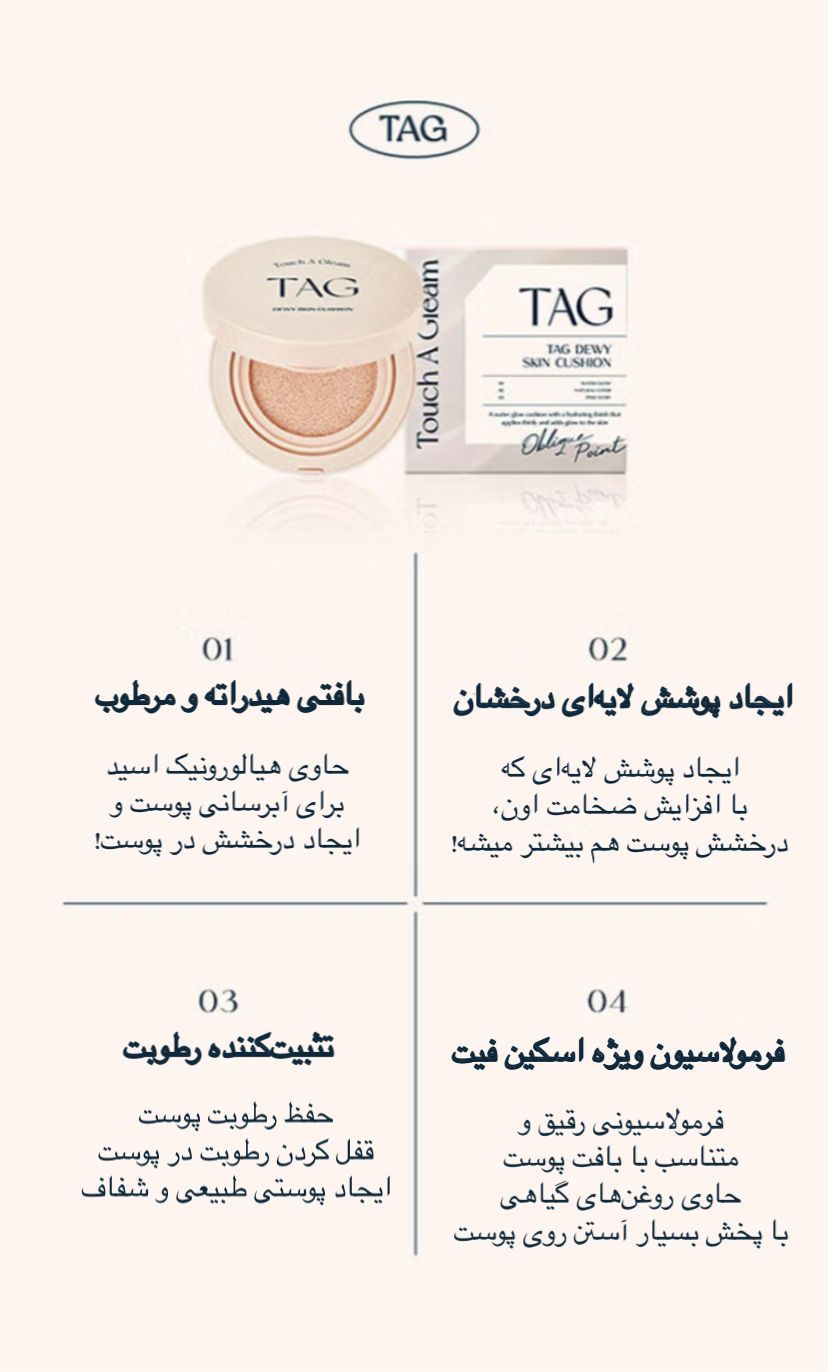 کوشن براق مدل Dewy Skin برند TAG انتخابی مناسب برای استفادۀ روزانه، جهت جایگزینی با کرمپودرهای سنگین بهشمار میرود. این محصول، بافتی یکدست و شفاف روی پوست ایجاد کرده و جلوۀ نهایی آن براق و هیدراته است. این محصول که با پوستهای نرمال، خشک و دهیدراته سازگاری کامل دارد، دارای +SPF50 بوده و پوست شما را نیز از آسیب اشعۀ فرابنفش خورشید پیشگیری میکند. هیالورونیک اسید موجود در ترکیبات این کوشن، سبب آبرسانی عمقی پوست شده و فرمولاسیون ویژۀ آن باعث قفل کردن رطوبت در پوست شما میشود. از جمله مزایای استفاده از این محصول، میتوانیم به؛ پوششدهی بالا، خواص سفیدکننده، بهبود چینوچروکهای پوستی، عدم ایجاد حالت کیکی و پوستهپوسته و همچنین ایجاد ظاهری شیشهای و شفاف اشاره کنیم.