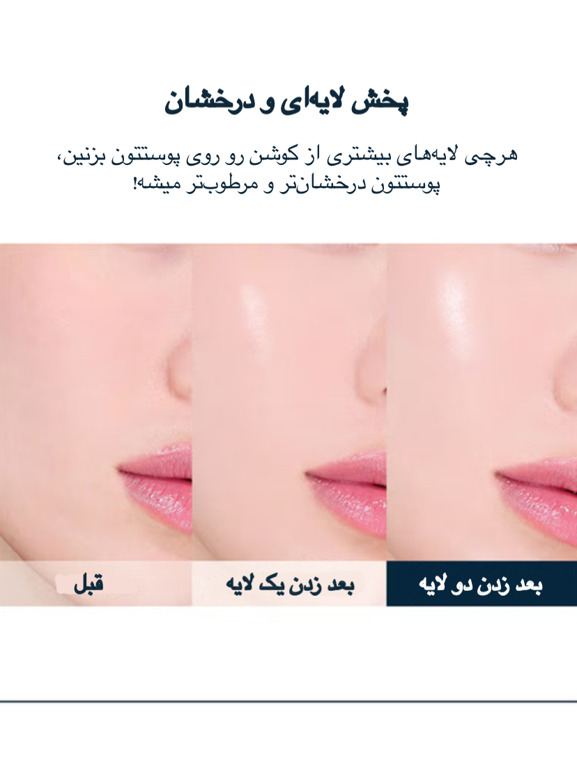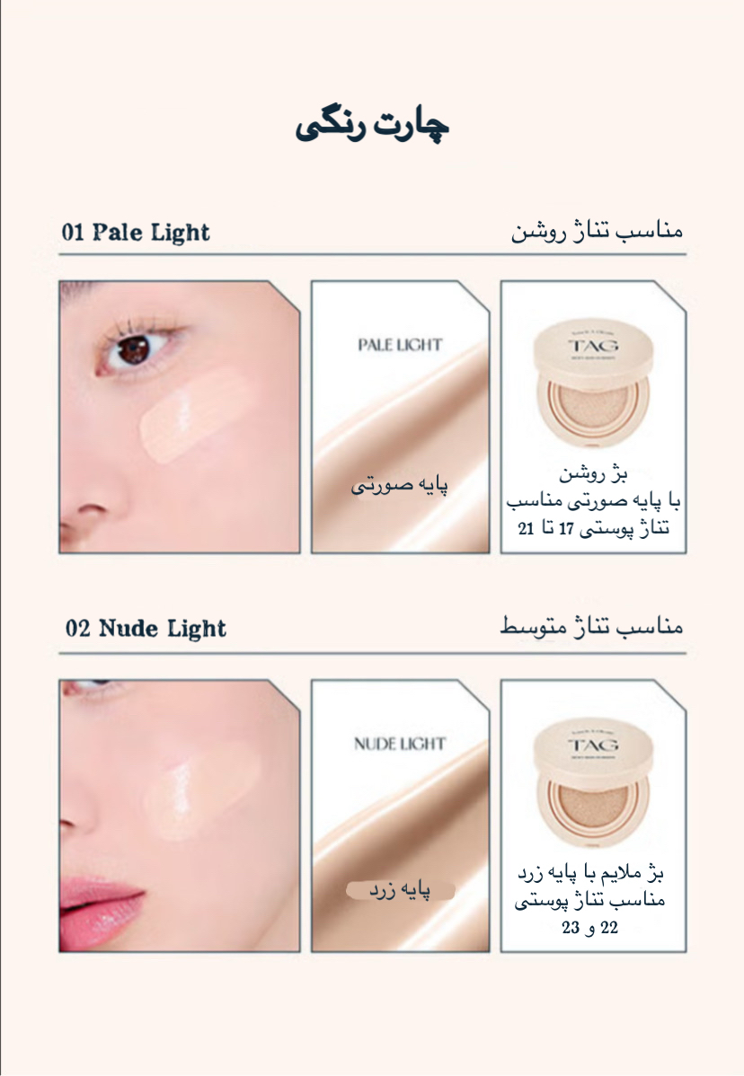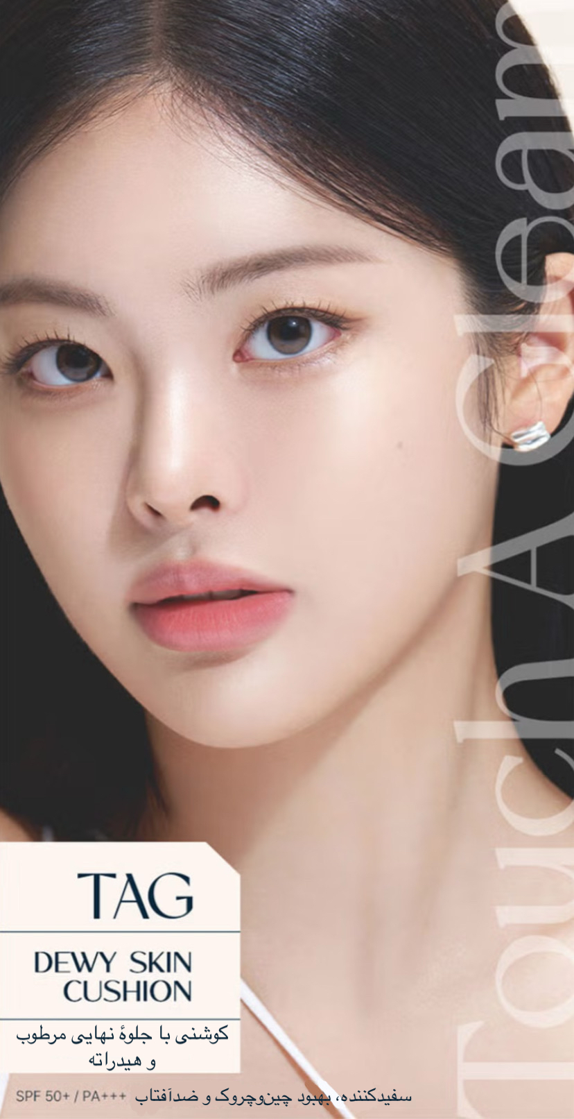 کوشن براق مدل Dewy Skin برند TAG انتخابی مناسب برای استفادۀ روزانه، جهت جایگزینی با کرمپودرهای سنگین بهشمار میرود. این محصول، بافتی یکدست و شفاف روی پوست ایجاد کرده و جلوۀ نهایی آن براق و هیدراته است. این محصول که با پوستهای نرمال، خشک و دهیدراته سازگاری کامل دارد، دارای +SPF50 بوده و پوست شما را نیز از آسیب اشعۀ فرابنفش خورشید پیشگیری میکند. هیالورونیک اسید موجود در ترکیبات این کوشن، سبب آبرسانی عمقی پوست شده و فرمولاسیون ویژۀ آن باعث قفل کردن رطوبت در پوست شما میشود. از جمله مزایای استفاده از این محصول، میتوانیم به؛ پوششدهی بالا، خواص سفیدکننده، بهبود چینوچروکهای پوستی، عدم ایجاد حالت کیکی و پوستهپوسته و همچنین ایجاد ظاهری شیشهای و شفاف اشاره کنیم.